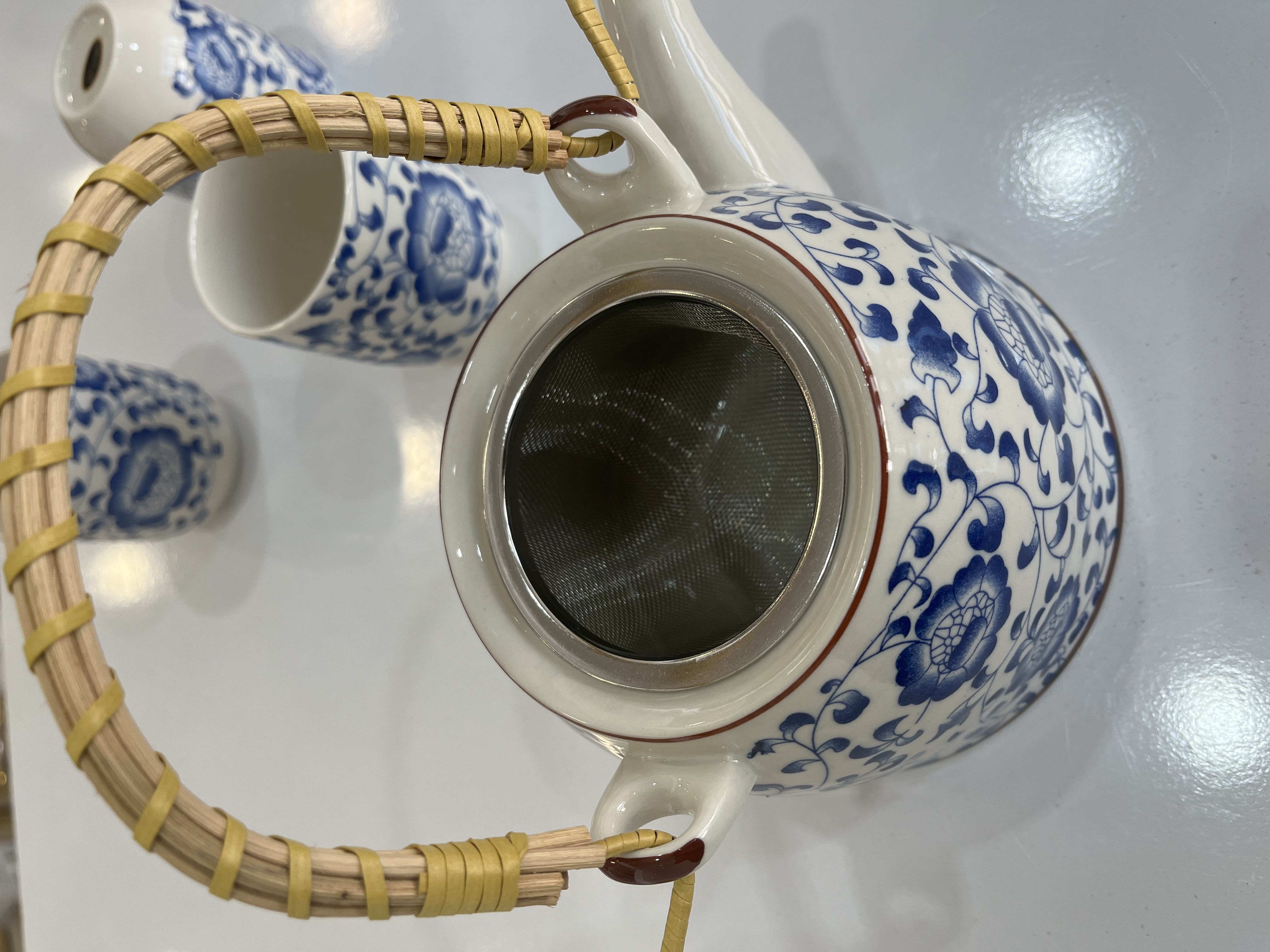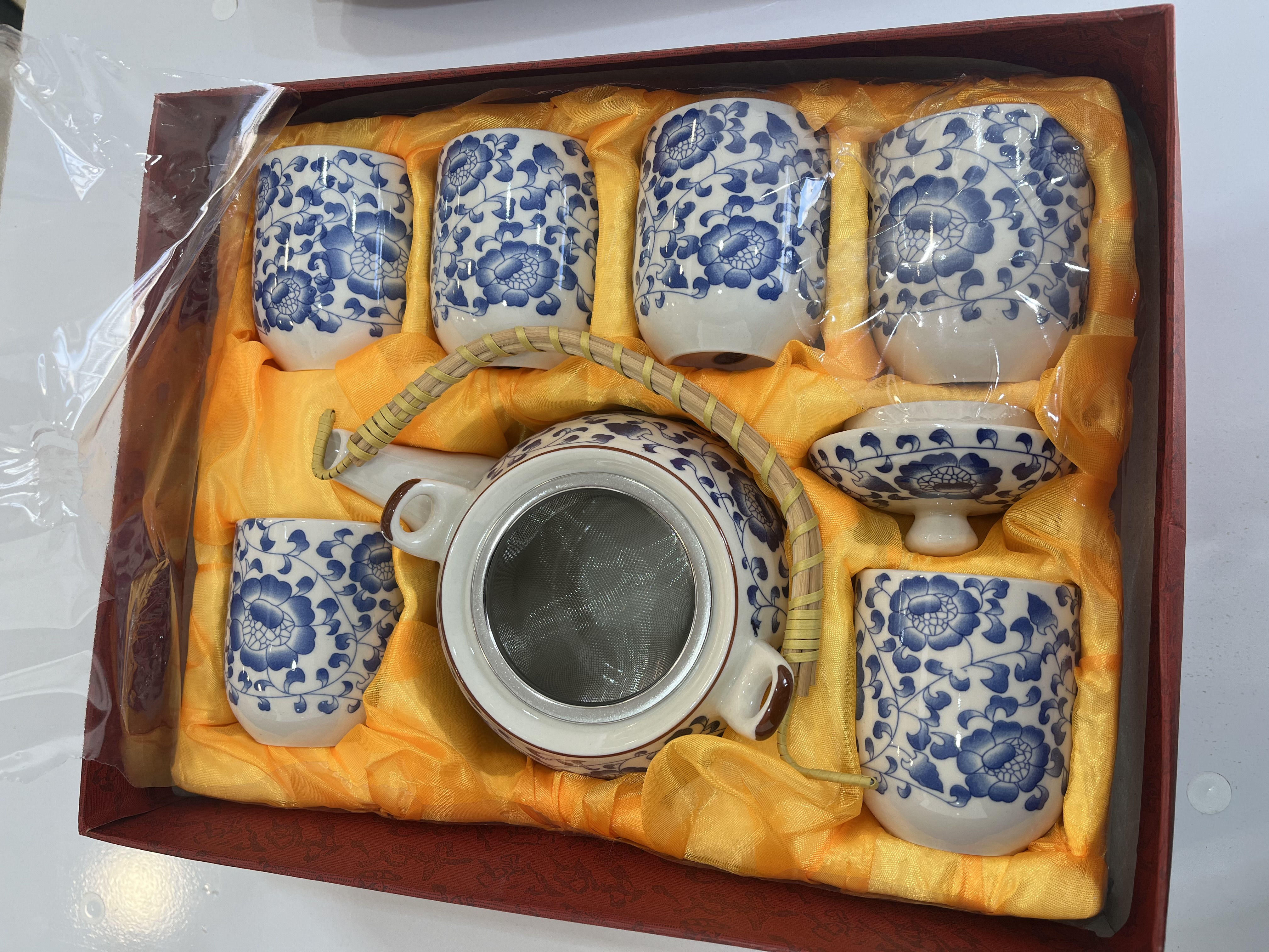 این ست شامل یک قوری به همراه صافی فلزی و دسته حصیر بافت بامبو می باشد که به همراه ۶ فنجان، یک ست چای خوری کامل را ارایه میدهد .دارای بسته بندی شیک و کادویی.کاری شیک و چشم گیر.